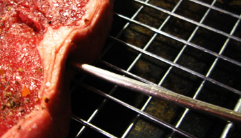 Thermometer. In this method, temperature, rather, than time provides the crucial cues. If you don’t have a thermometer, you can guess what’s going on by using the times and temperatures, thickness and cut that I give. However, results may vary depending on your oven and source of beef.